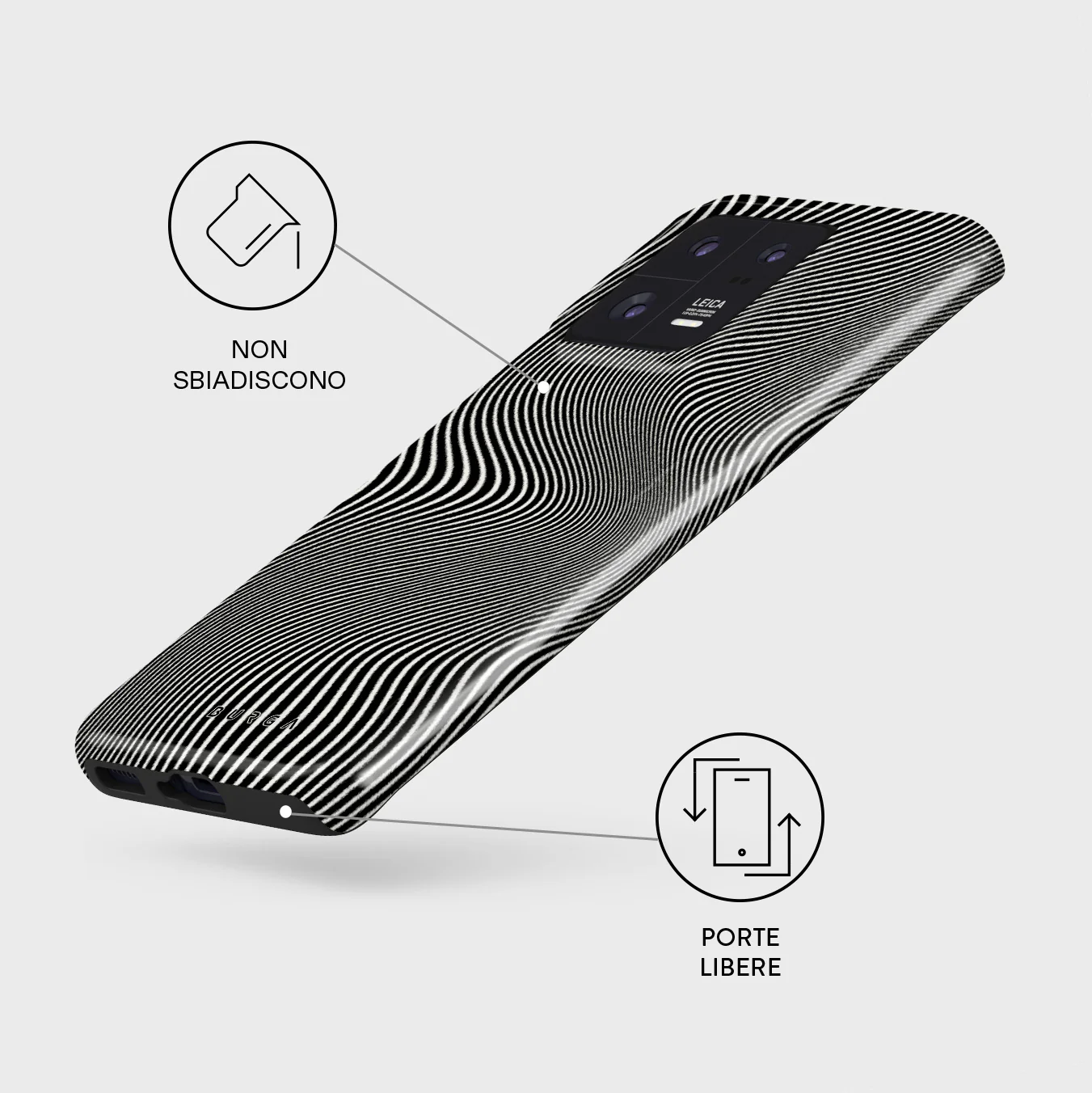 Questo design include: linee sinuose, trama ondulata, colore bianco, colore nero, effetti ottici, motivo astratto